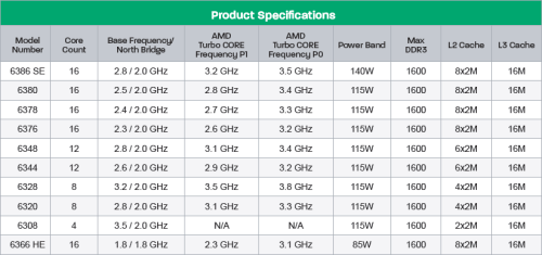 四核方面近Opteron 6308一款,八核包含Opteron 6328和6320两款,十二核也只有Opteron 6348、6344两款,其余5款为十六核心,型号分别为Opteron 6386 SE、6380、6378、6376、6366 HE,值得一提的是16核心的6376已经被应用在世界顶级超级计算机Titan,产品提供多达20PFlops的计算性能。