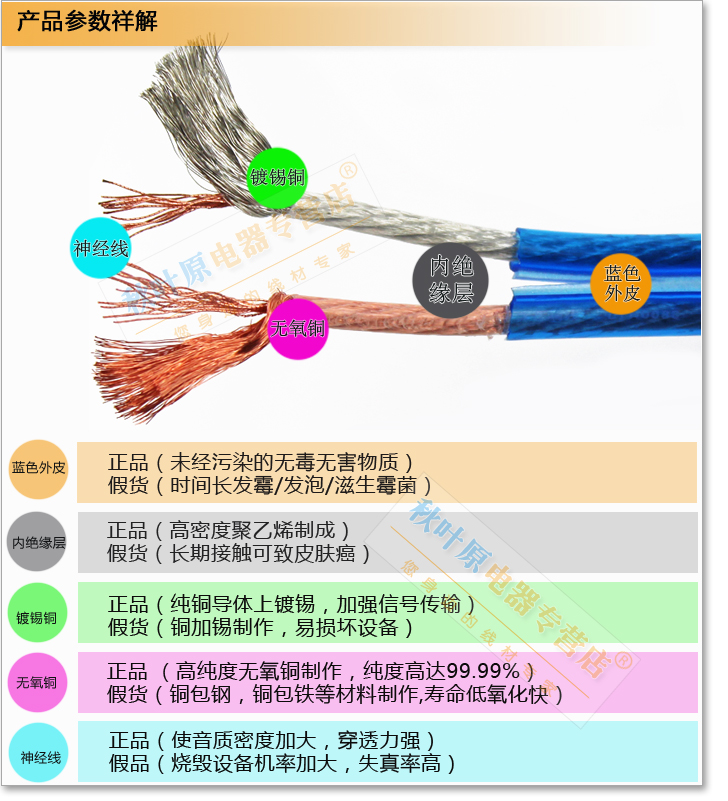 亲们注意啦!最近该型号市场上出现了大量的假货以低价格冲刺市场。造成消费者花了钱而购买不到优质的喇叭线。提醒各位亲,购买时候看清产品描述,此型号秋叶原公司只授权本公司唯一一家(秋叶原电器专营店)销售。而且该型号为定制款,线身以及整卷标示上打的标签以及型号为LYH-0088,而不是其他型号。购买时候请注意假冒伪劣产品。