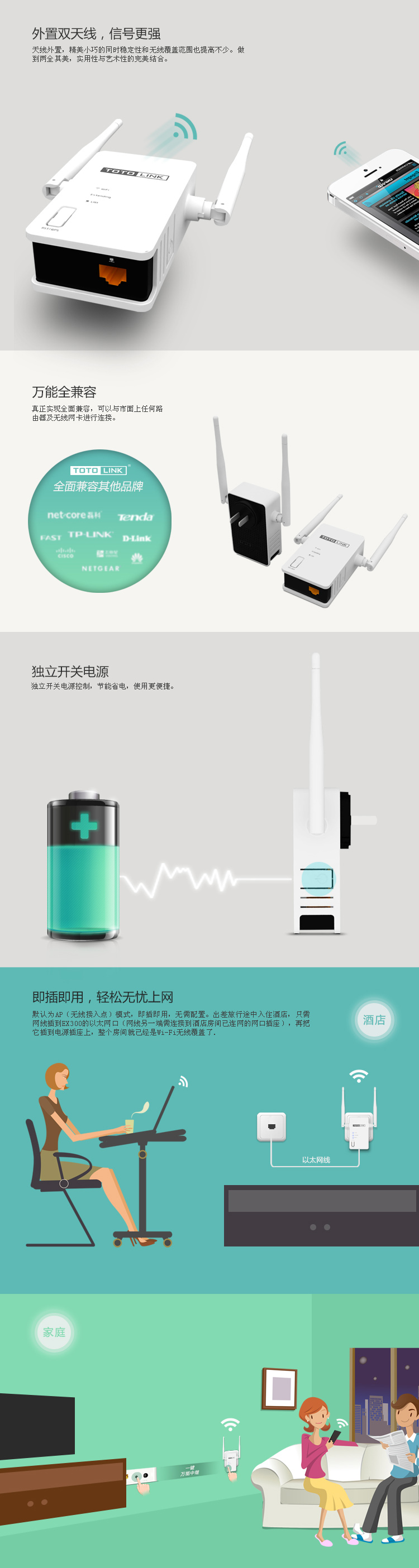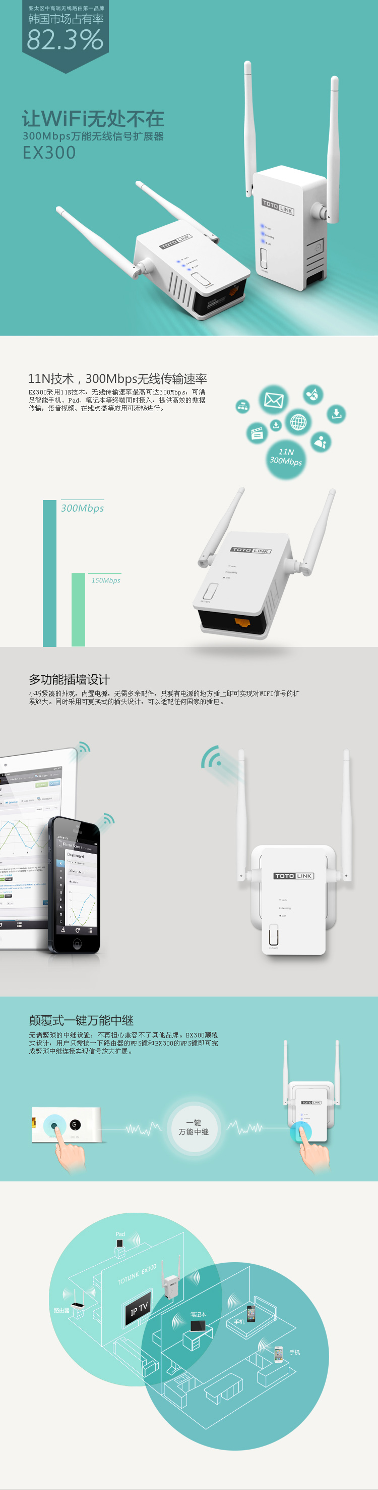 TOTOLINK EX300用户可以通过此设备延长无线网络距离,可以使更多的无线设备访问互联网,更方便的提供无线网络给iPhone和iPad,iPod播放器,笔记本电脑,智能手机,游戏机和电视等无线终端。