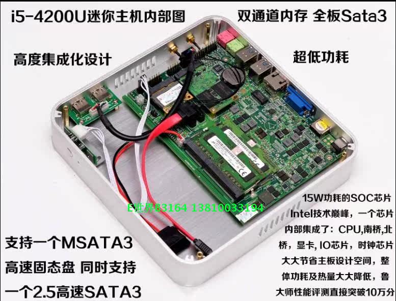 全新上市,超小迷你无风扇整机,i5-4200U支持双显支持同步异步双显,千兆网卡,USB3.0四个,USB2.0二个,支持msata固态硬盘,支持2个内存插槽,机箱使用全铝合金材料,可以起到整体散热的作用,机器尺寸:197*197*29MM