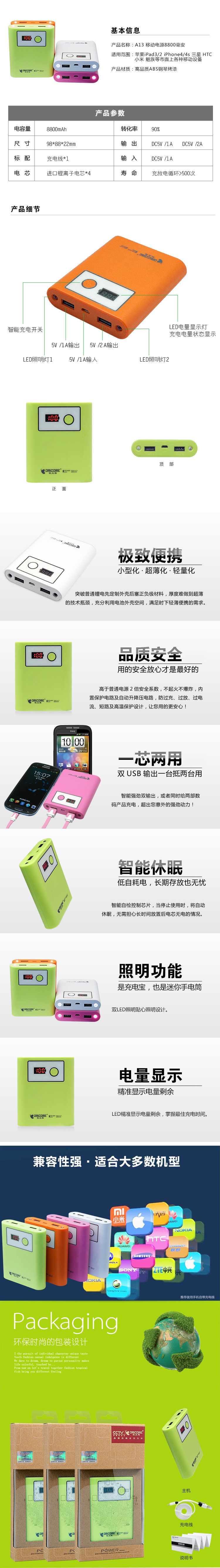 欧立格 移动电源 充电宝A13 苹果iphone54S三星通用 8800毫安包邮
