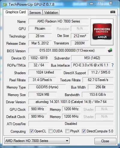 显卡:微星HAWK HD7850/1GB/DDR5/256BIT白金版原装显卡(畅玩大型三D游戏)