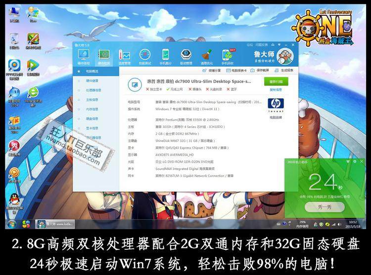 采用高主频CPU,2G双通内存和32G固态硬盘组合,速度极其给力,比起其一两千的全新主机毫不逊色。