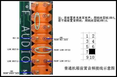 联想主板前置音频13针示意图,用于普通机箱前置音频接线需要DIY,将图中右侧9针接线图中的9、10拔出插到3、4,然后插到13针前置音频的7 8 9 10 11 12 13中即可,如果不接前置音频,部分联想主板需要用跳线帽短接9 10 和 11 12,否则后置音频没有声音输出。