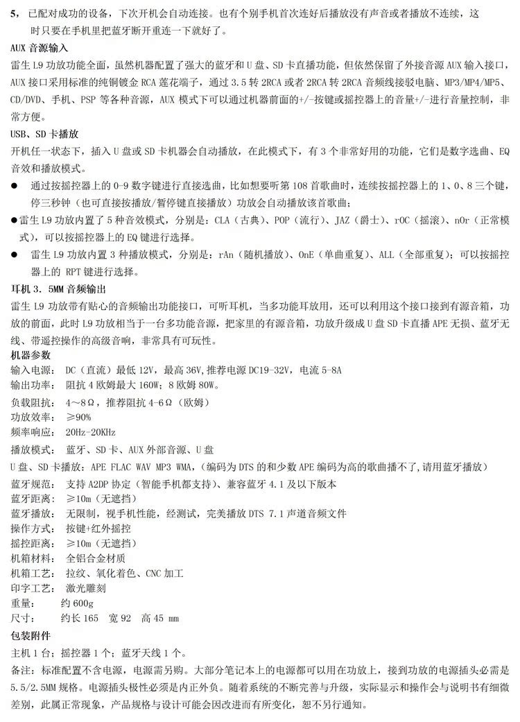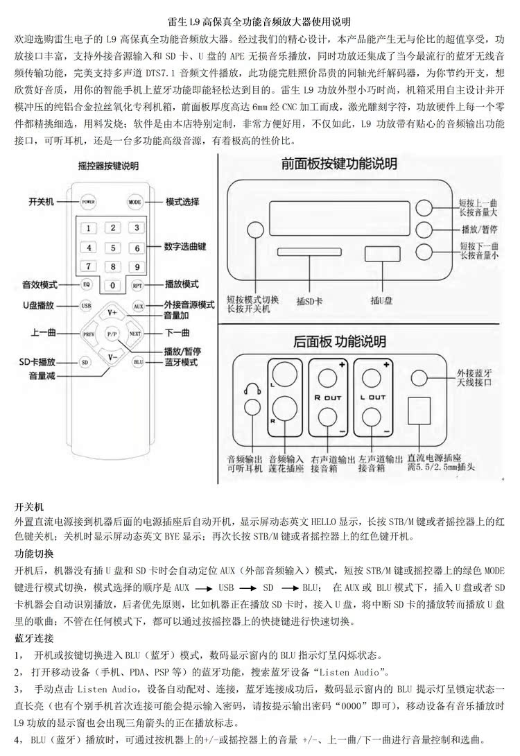 L9无损解码蓝牙功放是雷生电子原创,深圳工厂生产,机器使用简单,支持环保,不再提供纸质说明书,需要电子档说明书的买家请自行下载(详见本页下面说明书图片),谢谢。
