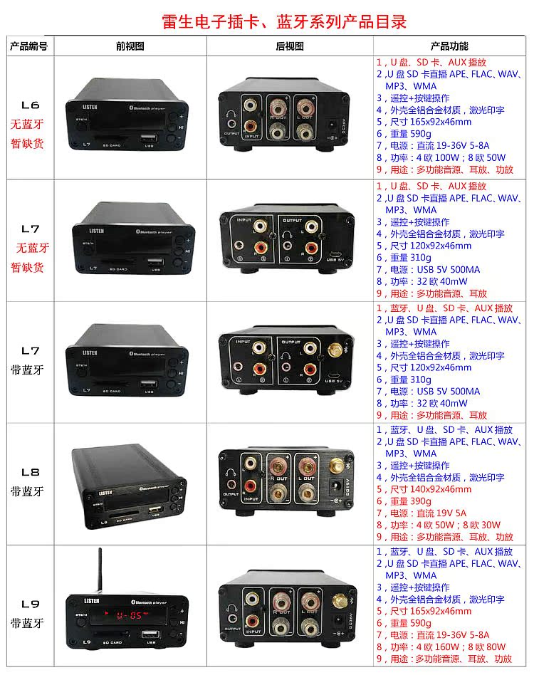 雷生L9具备外部模拟输入,支持U盘,SD卡和蓝牙功能于一身,使用面板上的轻触开关或者摇控器进行切换,同时面板数码显示窗会指示当前功放的状态,特别值得一提的是,市面上带U盘和SD卡的功放只支持MP3播放,而L9除了播放MP3格式外,还可以播WMA和无损APE、FLAC、WAV文件,这些是我们产品独有的功能。