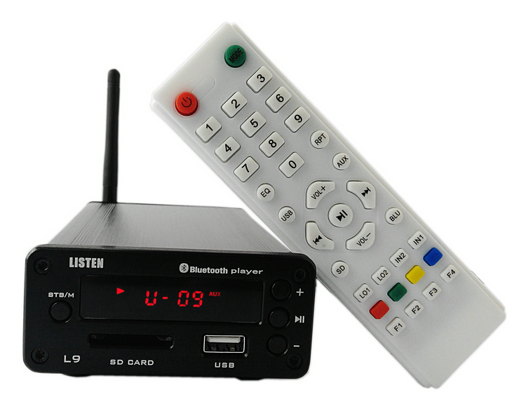 L9无损解码蓝牙功放支持APE、FLAC、WAV、MP3、WMA等主流的音频格式,支持U盘、SD卡、蓝牙播放,这意味着用户可以把歌曲复制到U盘或者SD卡里插到功放播放,完全脱离电脑听歌,功放配备摇控器,是目前网上唯一 一款支持U盘、SD卡无损和蓝牙播放带摇控操作的数字功放机。机器设计精密,外观时尚,无论是家用或送礼都有面子。主机保修一年。
