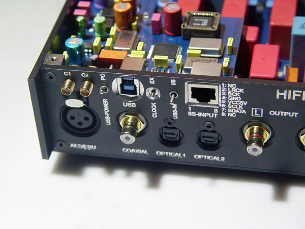 USB解码电路带有双时钟输入接口,通过后面板的USB时钟开关切换打开内部的时钟或外接时钟输入(后面板上的C1与C2为时钟输入接口,C1接口可外接49.152MHZ(或24.576MHZ)的超高精度时钟输入;C2接口可外接45.1584MHZ(或22.5792MHZ)的超高精度时钟输入的外部时钟时,(或接高精接度低相噪时钟铷钟RB原子钟,实时体验目前最高级别数字音频解码器的声音效果),开关请拨到EX位置(EX表示EXTRA,即外接时钟的意思);否侧请拨到colock位置选择内部时钟,USB解码才能正常工作哦)。这种接口一般只有几万元的解码机器器材才会有的相当高端的哦。