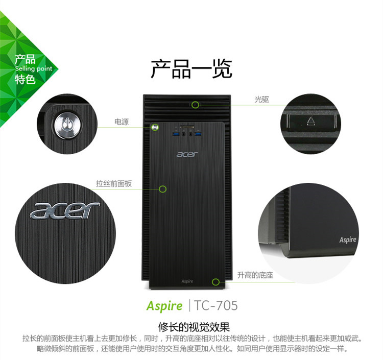 https://item.taobao.com/item.htm?spm=686.1000925.0.0.Xsc3Ld&id=528724807681顺滑的前表面,时尚的外观,精细的磨砂做工彰显现代风尚。 Aspire T 系列非凡的机箱设计外观典雅、功能性强。 嵌入式光驱采用前面板内置设计,功能强大,保持整体外观协调。 其位于前置端口和插孔上方,方便使用。