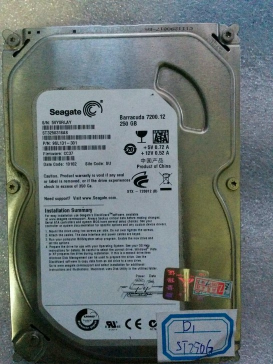 D1。希捷250G台式串口硬盘。健康无坏道。7200转。薄盘。