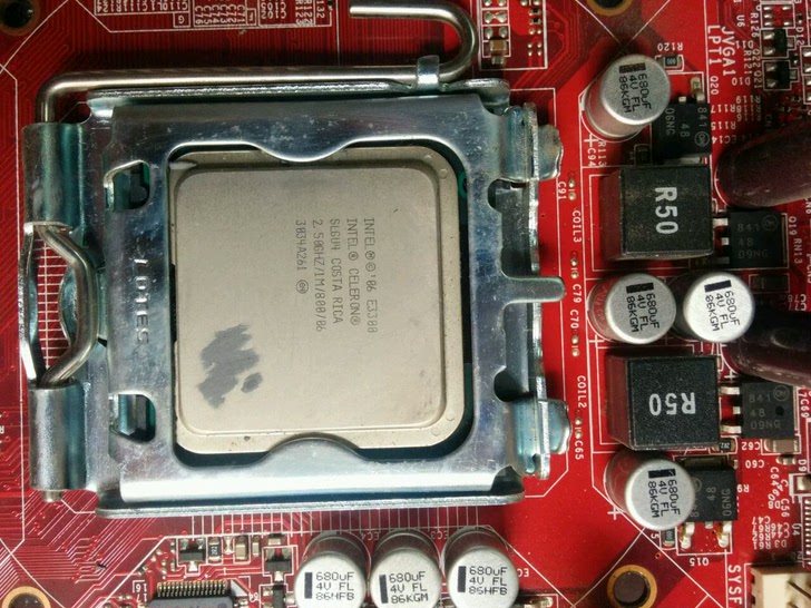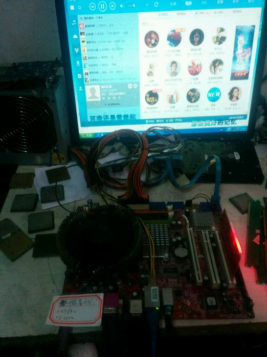 上机试板的时候都仔细些。今天有退货回来,毛手毛脚的买家把主板的CPU针脚弄歪了,两个针脚都叠在一起,板子肯定不亮。我挑开上电就点亮开机了。