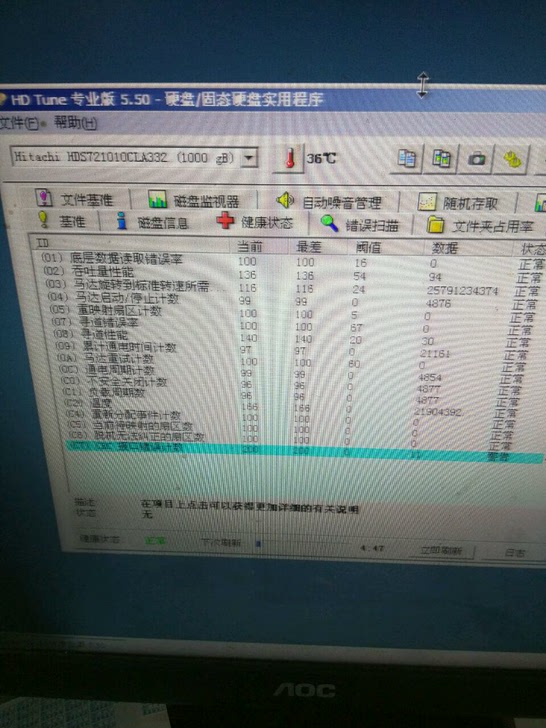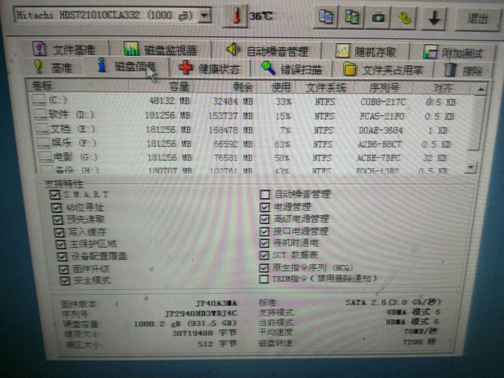 日立1TB台式。SATA接口。正常使用。健康如图。160元包邮。还有块瑕疵的日立1TB.欢饮打包。