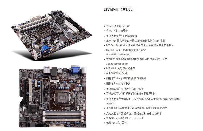 全新盒装精英/ECS Z87芯片组主板,主板规格为标准MATX尺寸(24.5x22)不是市面上那种简配的matx版型。支持软件风扇调速方便快捷,主板支持超频和双显卡交火,SLI,可以支持磁盘阵列。主板自带COM口和LPT(宽口打印机接口)和一条pci插槽。商用娱乐多重选择。