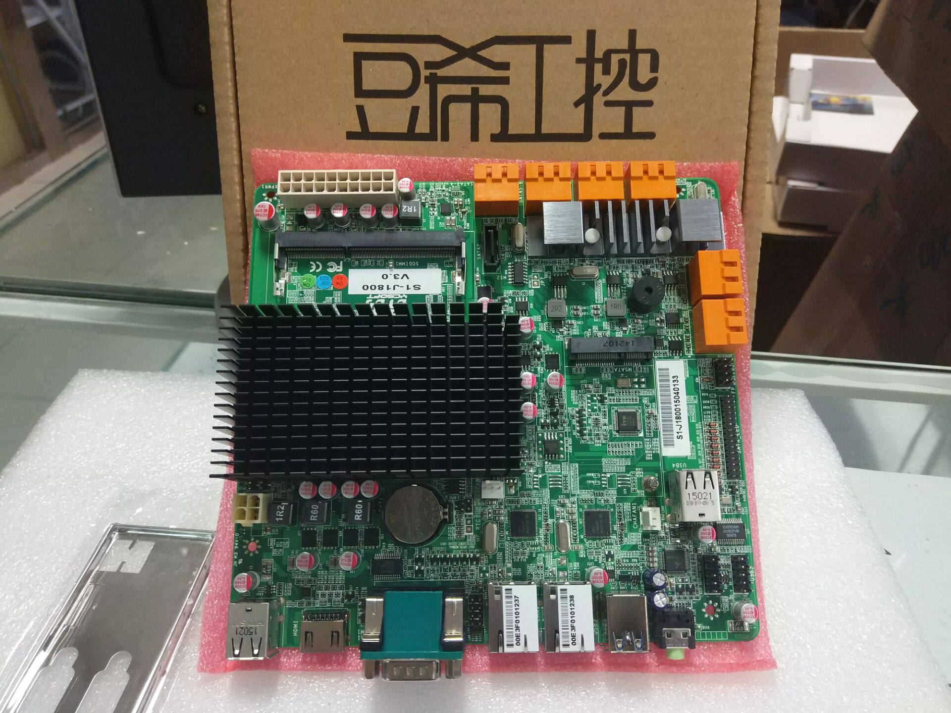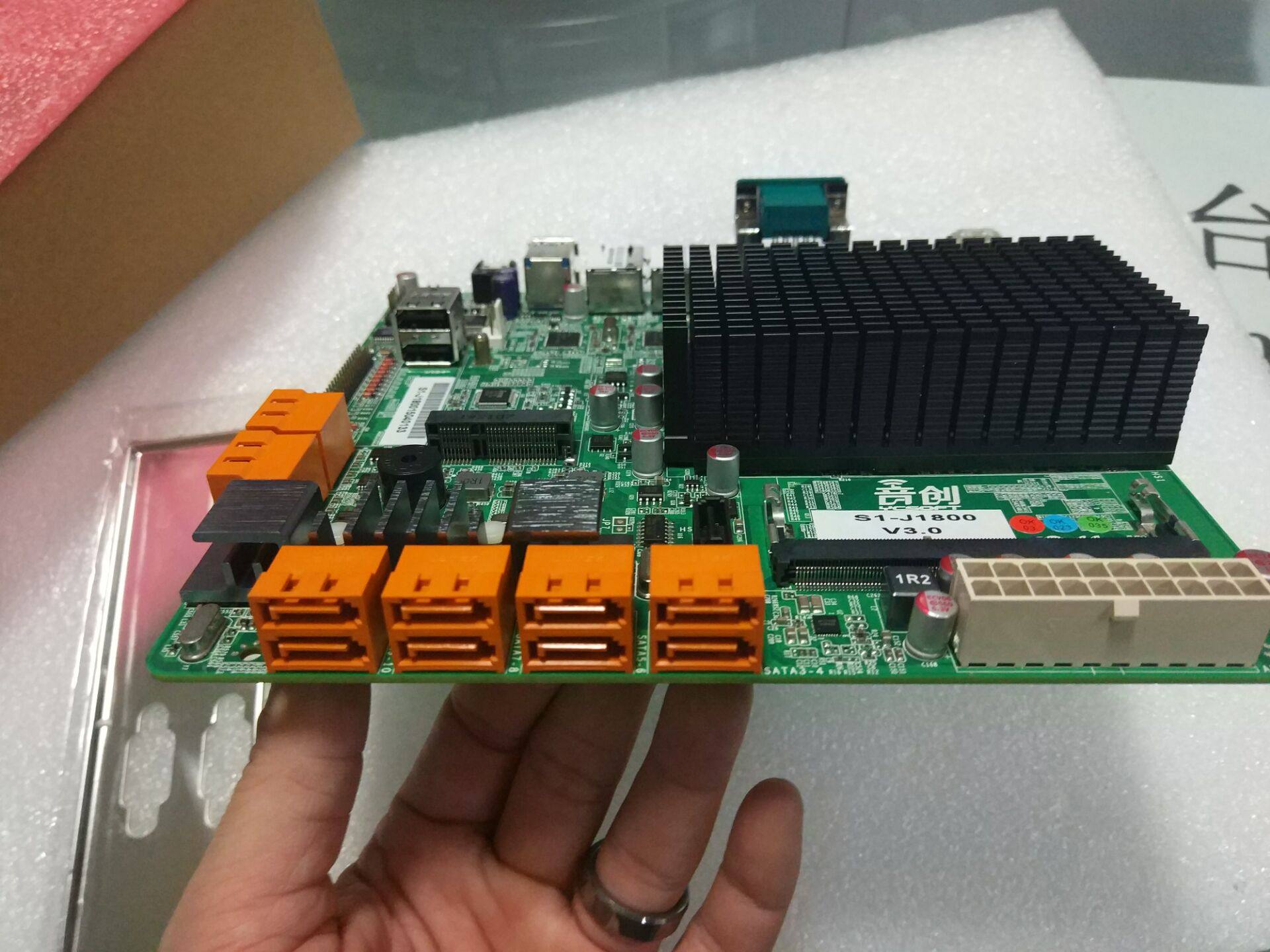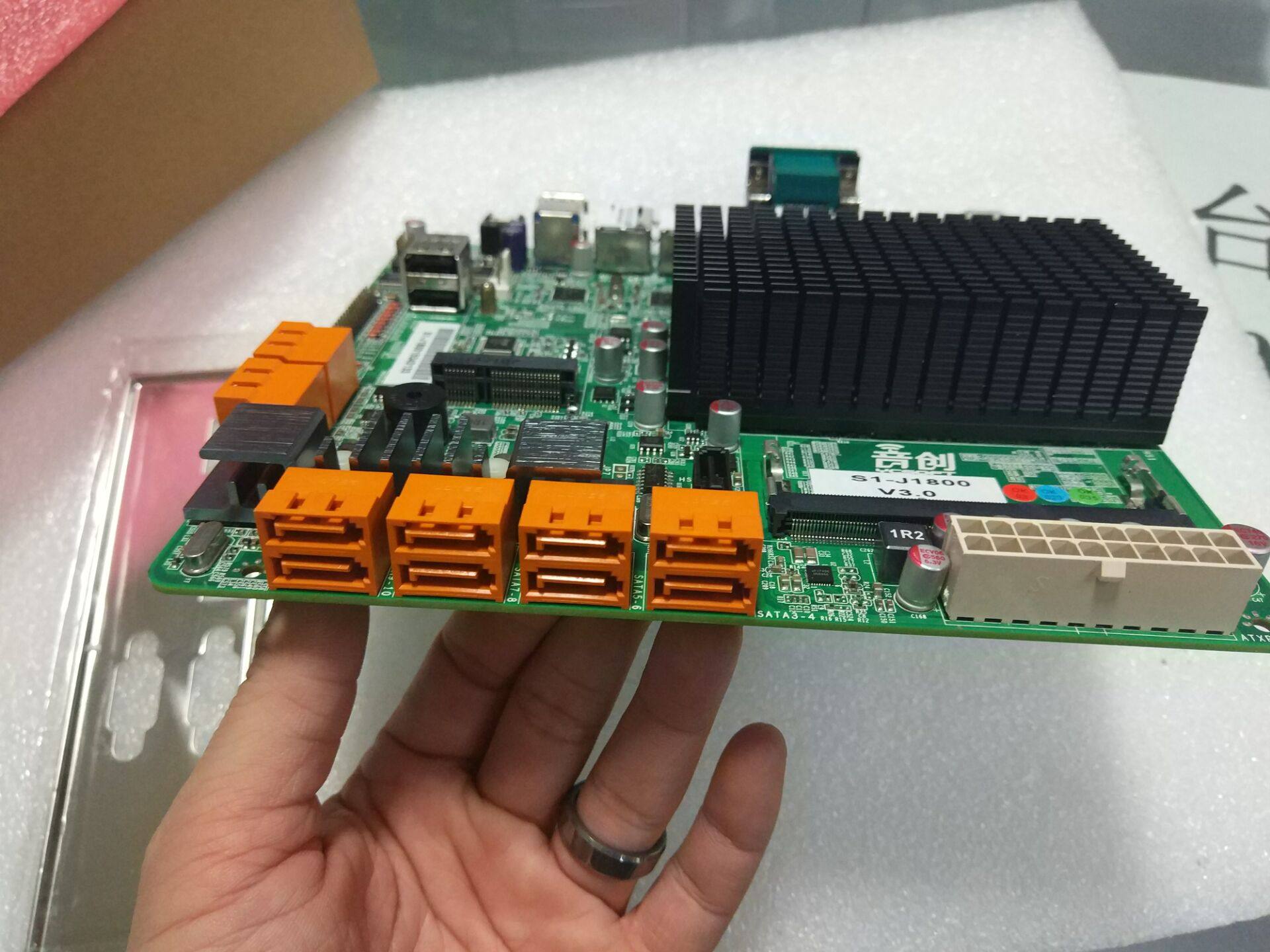 本款主板为J1800双核2.4G CPU,网卡为Intel双千兆新款网卡,支持12个sata扩展,支持msata,自带com串口等,为群晖NAS等云存储最佳搭配。 规格是17*18cm