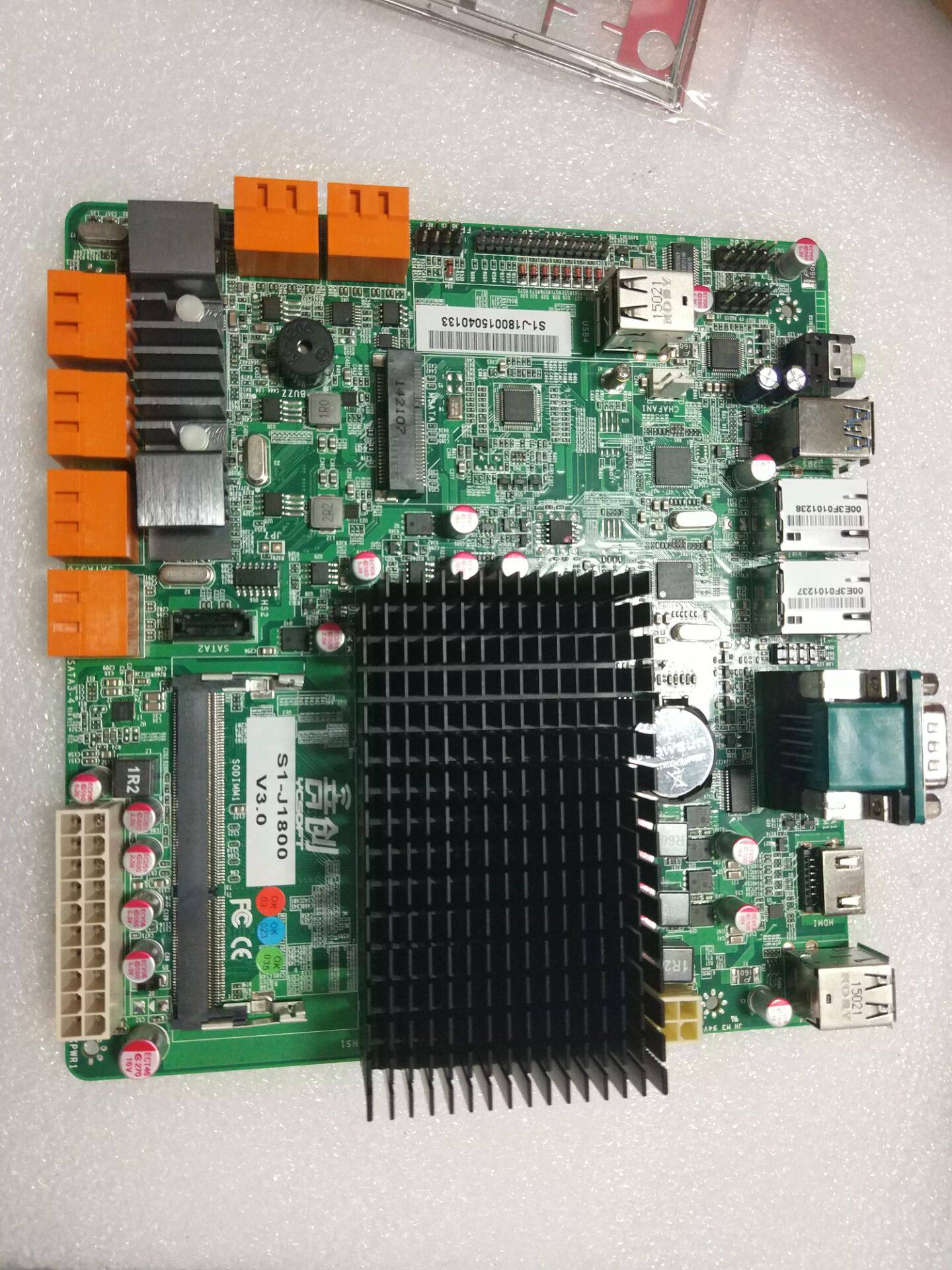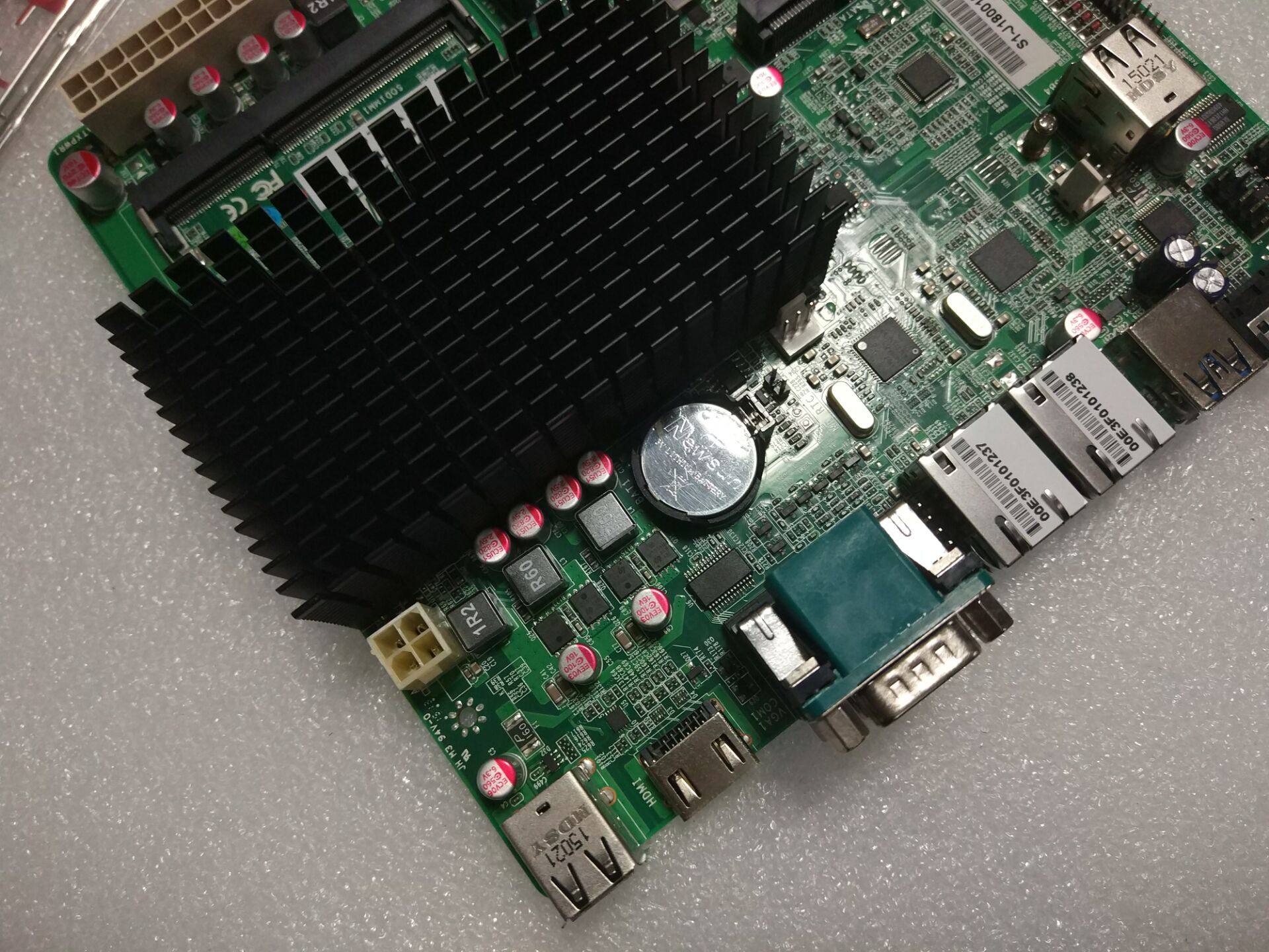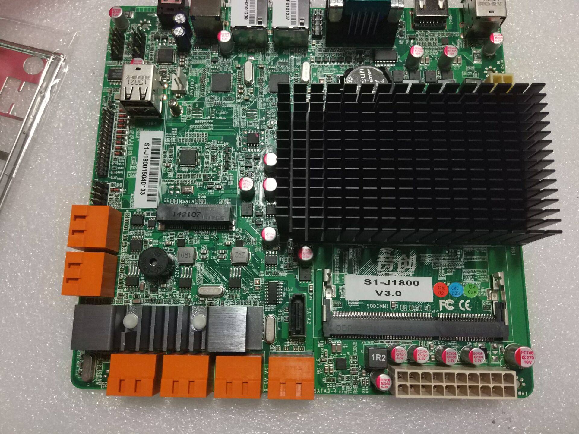 本款主板为J1800双核2.4G CPU,网卡为Intel双千兆新款网卡,支持12个sata扩展,支持msata,自带com串口等,为群晖NAS等云存储最佳搭配。 规格是17*18cm