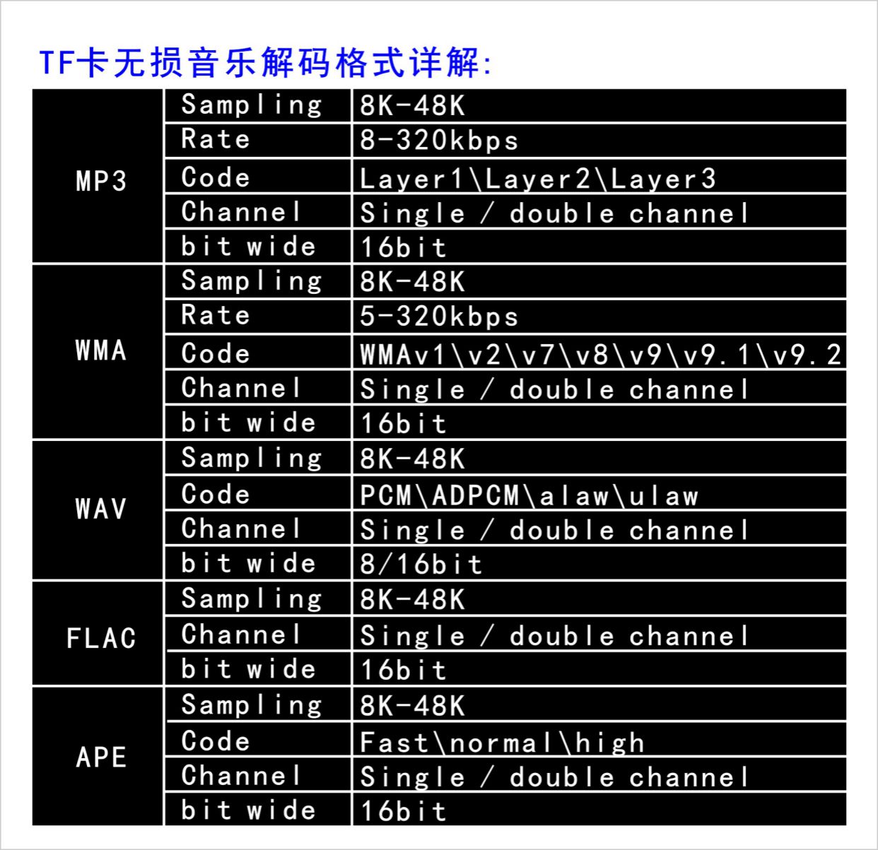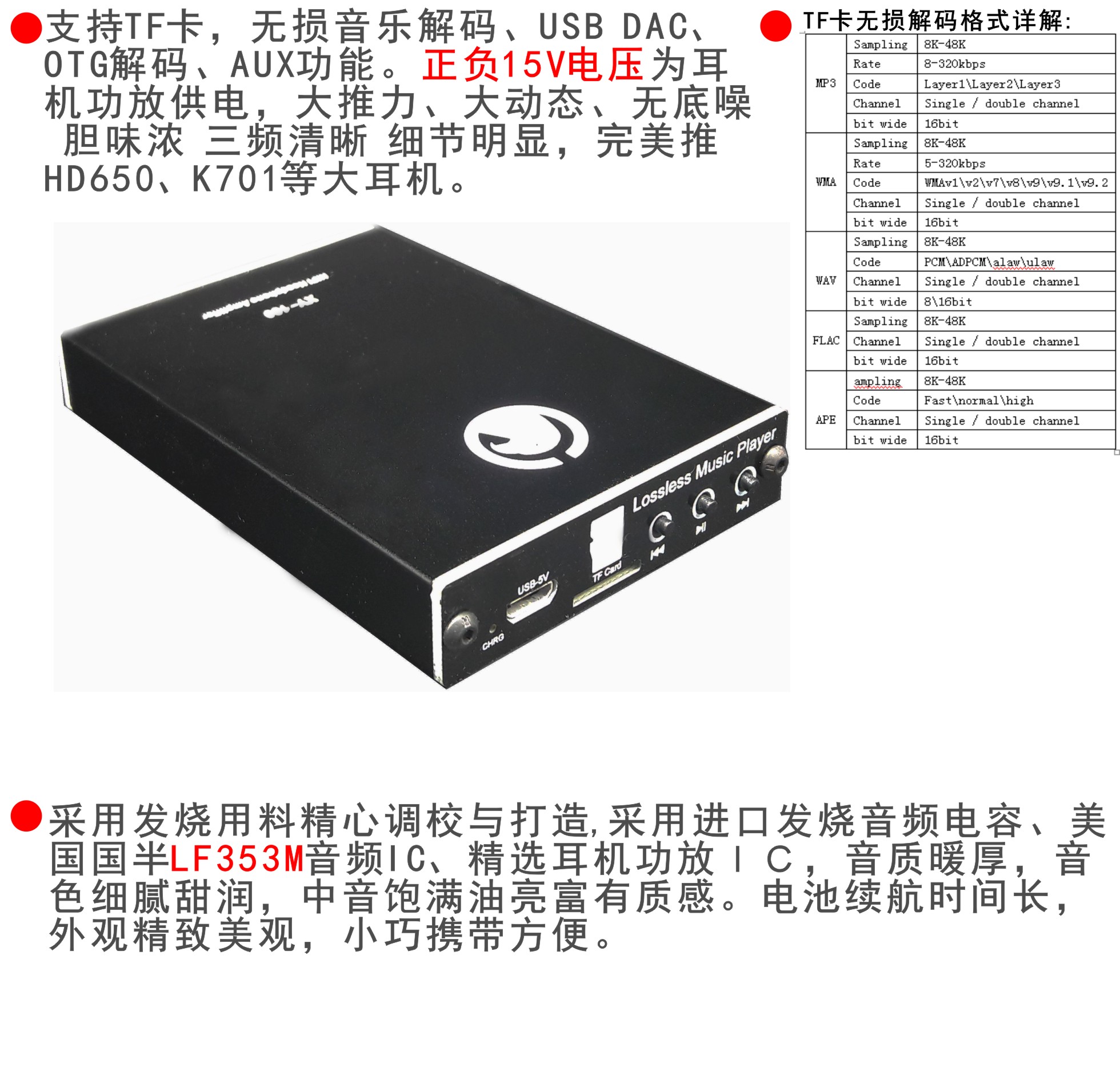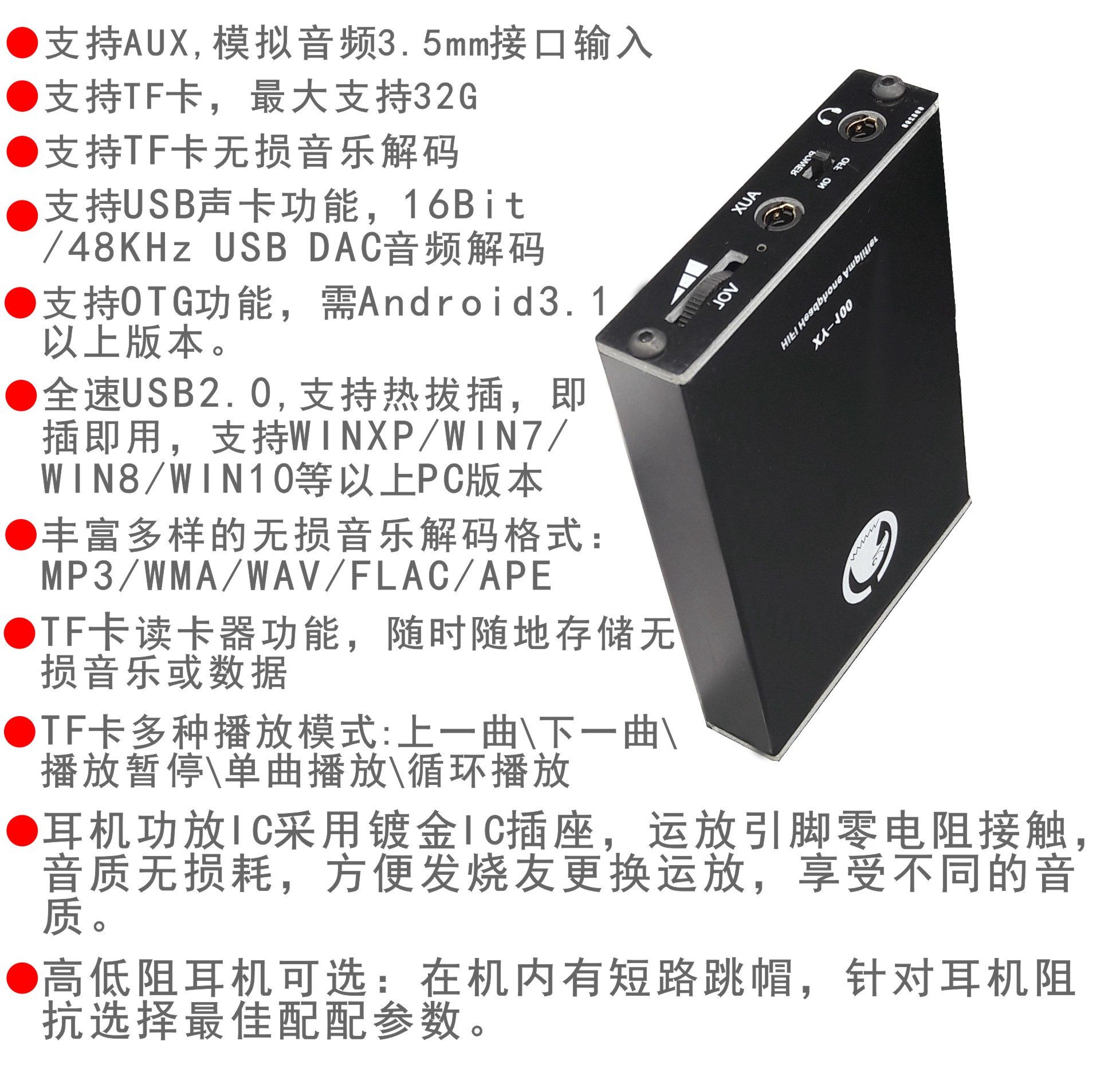 功能:支持TF卡,无损音乐解码、USB DAC、OTG解码、AUX功能。内置锂电池,小巧携带方便!