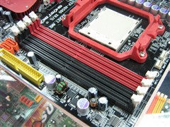 四条双色内存插槽、2组PCI-E x16支持双x16 Crossfire技术
