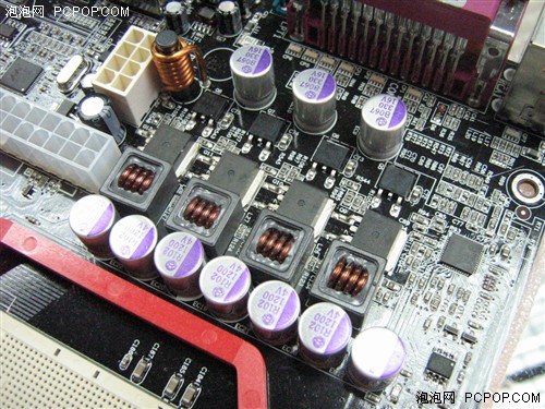 此主板采用四相回路供电设计,CPU供电部分电容全部采用了固态电容,搭配英飞凌MOSTE管与半封闭防磁线圈,在做工与用料上有充足的保证,能给CPU提供稳定的电流,也能让超频时更加稳定。并且在内存和显卡插槽供电部分的电容也全部是固态电容,这样的供电使得此主板在超频时,确保内存、显卡稳定的运行。最近,磐正对其旗下的大部分NF 5系列的主板都进行了供电电容升级。