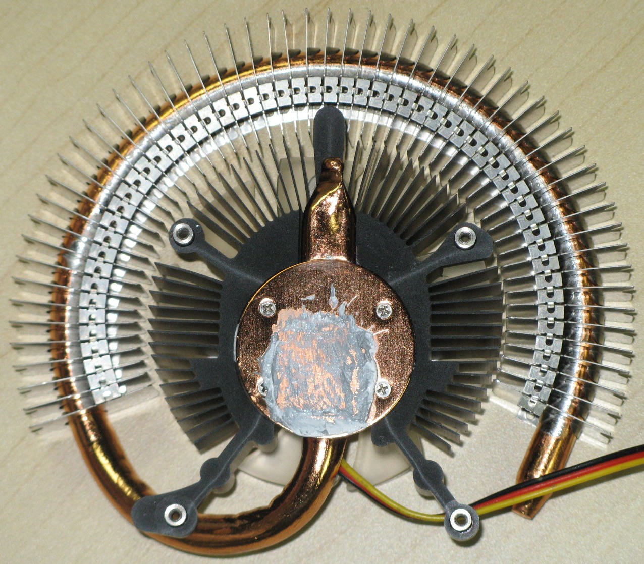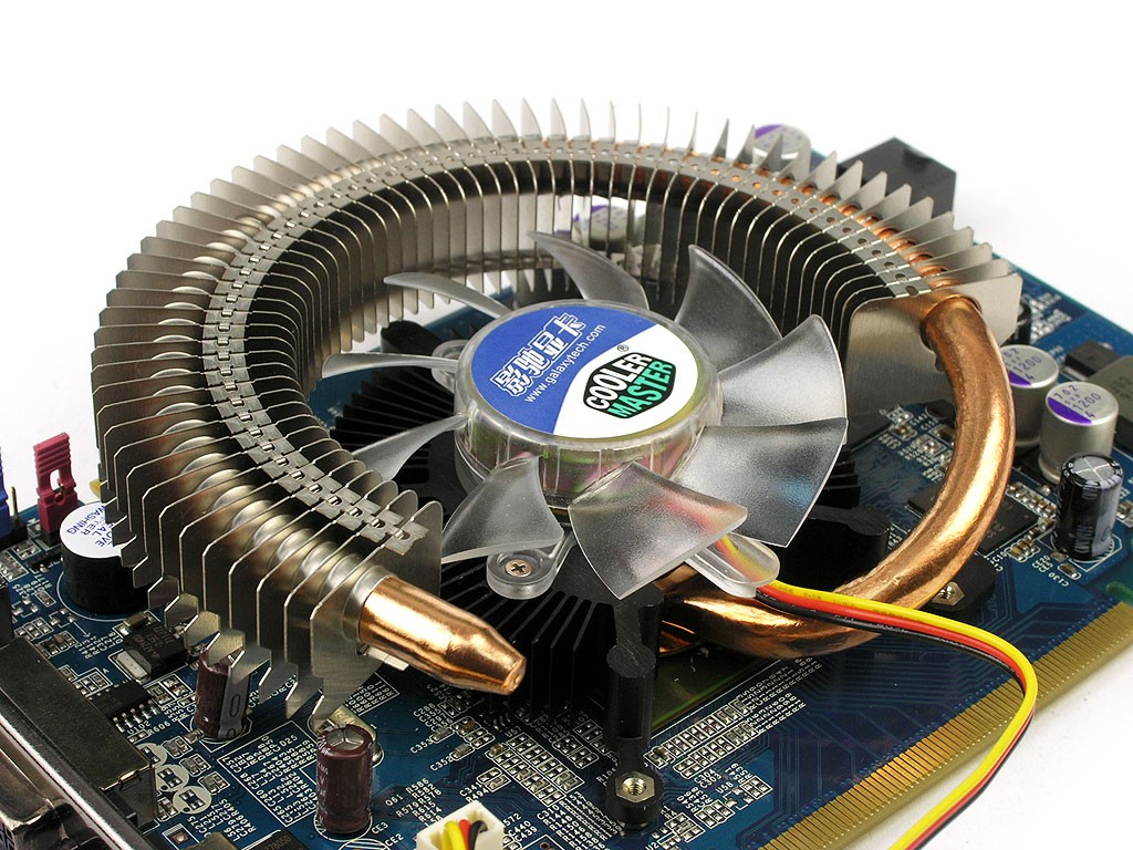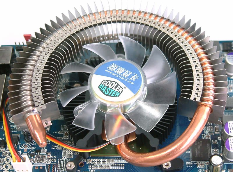 散热器底座直接与GPU接触相当于一个小散热片,风扇直吹放射状散热片进行散热。除此之外还通过一根粗壮的环形热管将热量导出至风扇边缘的散热片,从而达到更大的有效散热面积,这样只需很低的转速就能达到不错的散热效果,将噪音控制在很低的水准。