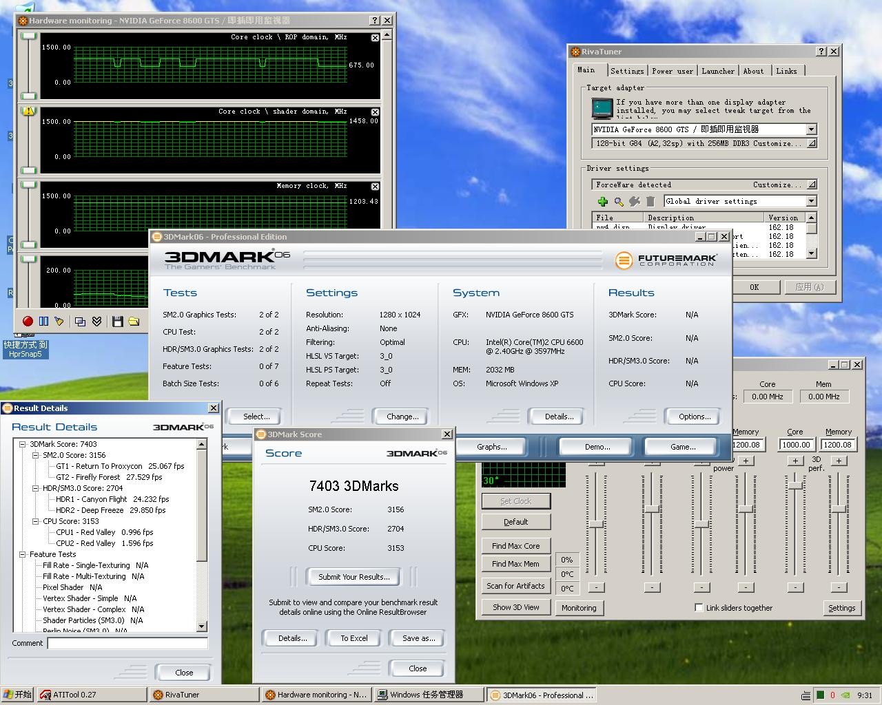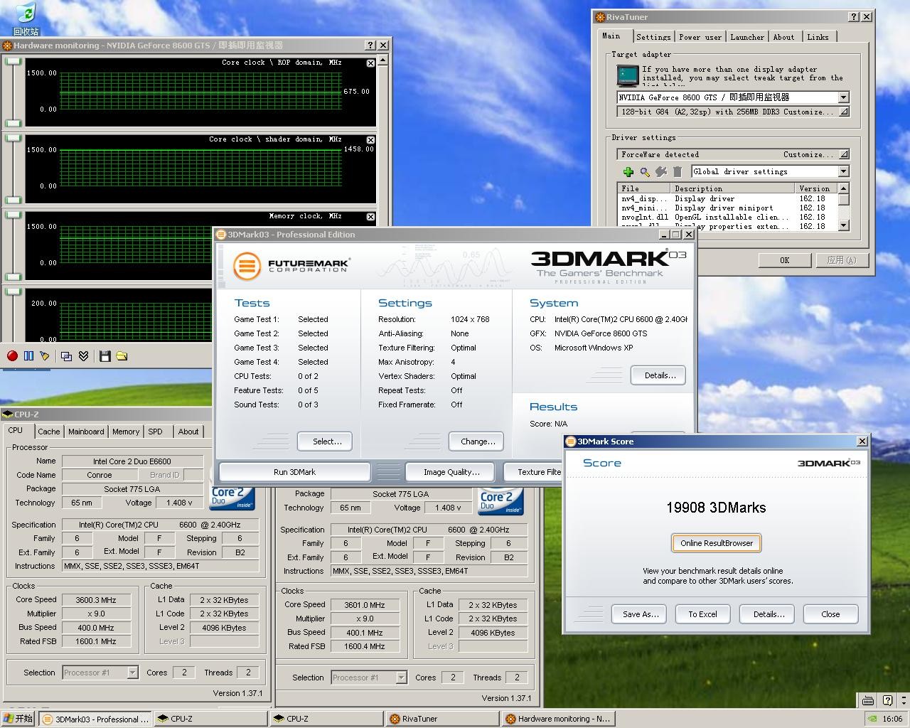 既然要超显卡,CPU也得超到极限,我们将手头这颗E6600超频到了3.6GHz,风冷情况下非常稳定,性能也得到了大幅提升。接下来先跑显卡在默认频率下的成绩。