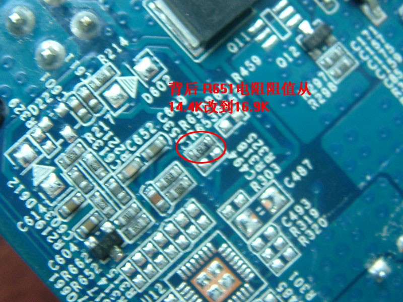 改造原理很简单,就是加大控制芯片附近的几颗电阻阻值,这样就能提高核心电压: