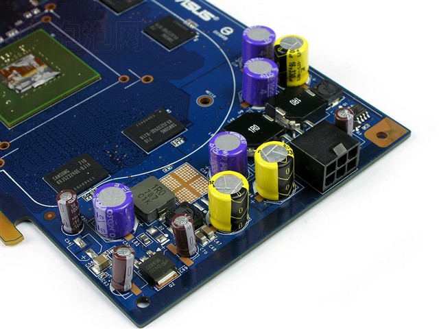 显存采用了三星的K4J52324QE-BJ1A芯片,生产周期是07年28周,也挺新。横着的那两颗显存芯片的字体像是印刷的,字迹清晰,看着是突出来的;竖着的两颗字体则像是刻进去的,有凹下去的感觉,而且不仔细辨认就几乎就看不到字迹。难道显存也要搞个鸳鸯配?!横着的两颗显存编号都是EGE09520,竖着的其中一颗也是,另外一颗则是EGE095Q
