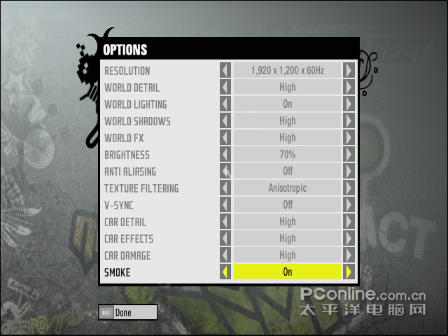 画质设定选项,我们关闭了垂直同步和全屏锯齿选项,其他的画质选项均设定为High,同时打开游戏的“World Light”和“Smoke”特效。游戏分辨率方面主要有以下四个:1024 x 768、1280 x 1024、1600 x 1200、1920 x 1200。