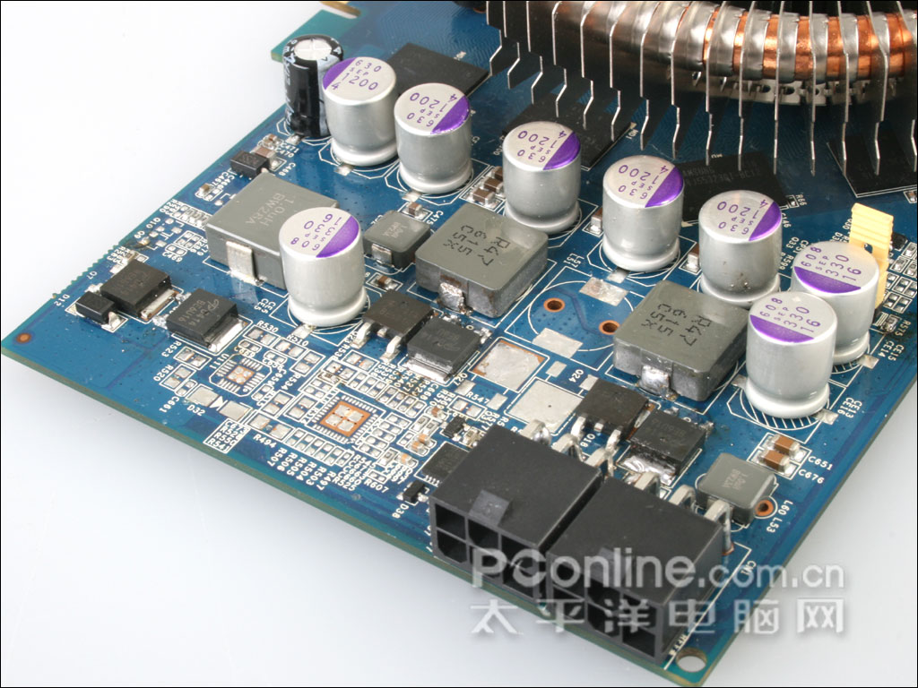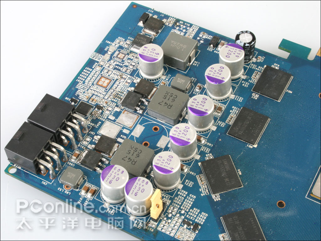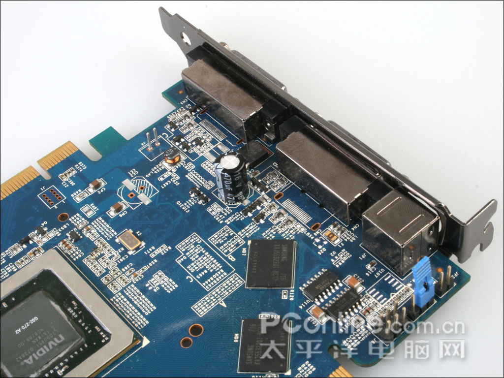 影驰 8800GT 256M DDR3遵循了其一贯作风,采用了自行研发的PCB底板,供电位上采用了大量三洋固态电容。应该是鉴于影驰 8800GT 256M DDR3的定位较GeForce 8800GT 512M稍低,因此在核心运行频率上也有所控制,我们也可以看见,显卡核心供电位空焊了一相供电位。显卡还提供了双6Pin电源以保证供电的充足,比起公版8800GT要多上一个6Pin电源口。