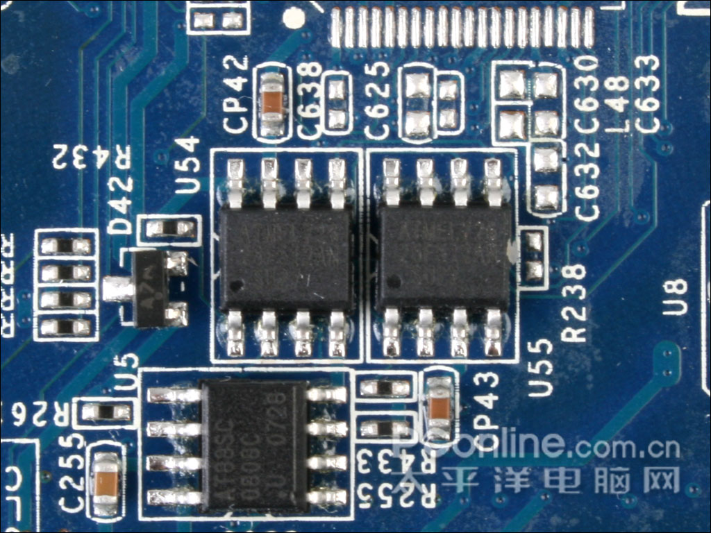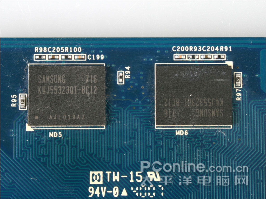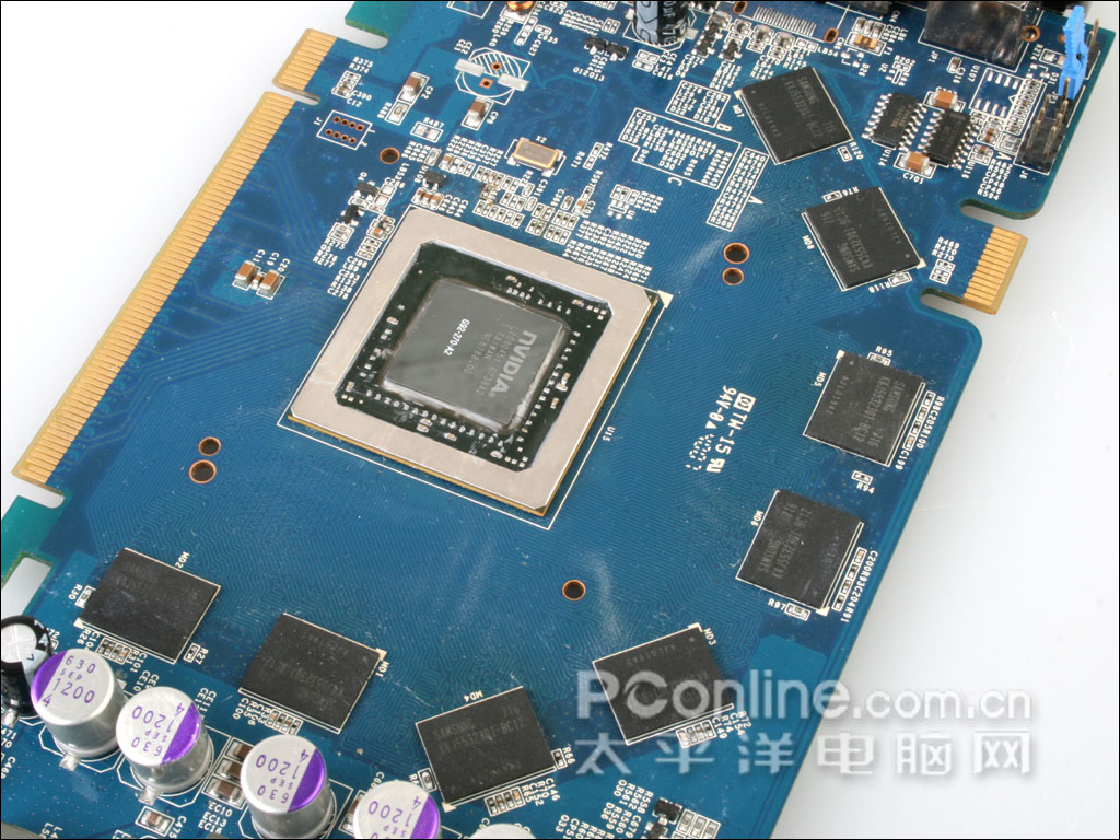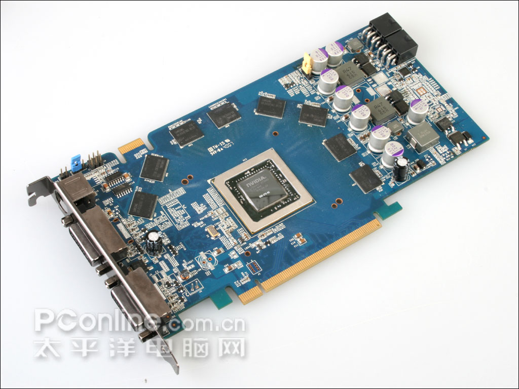 显存用料上,影驰 8800GT 256M DDR3采用了高品质的三星显存颗粒,显存编号K4J55323QI-BC12,在三星的显存颗粒中,前面的"K4J"代表GDDR3显存颗粒,而其后的"55",则代表单颗显存容量为256Mbit,即32MB,随后的"32"代表了单颗32bit显存位宽,因此该显存的规格为8Mbit x 32bit,显卡一共采用了八颗显存颗粒,组成了256M/256bit的规格。而BC12表示了它的显存速度为1.2ns。显卡的默认频率为600/1800Mhz,而核心Shader频率则为1500Mhz。