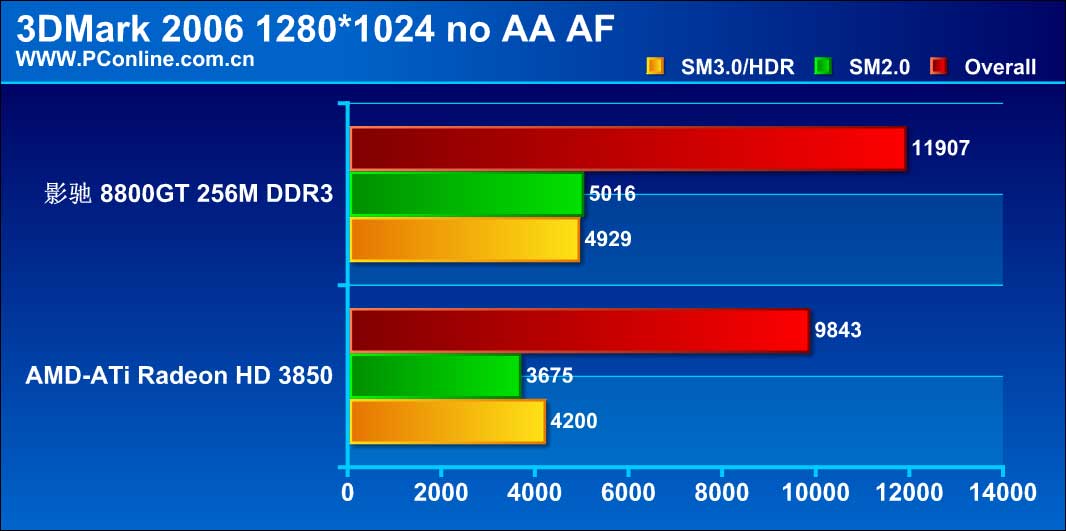 [/url] 按照常例,我们首先进行的,当然是这款经典的3D性能评测工具3DMark2006,由于影驰 8800GT 256M DDR3的运行频率和公版8800GT 512M的一样,因此在我们常用的1280*1024分辨率下,影驰 8800GT 256M DDR3的理论成绩还是遥遥领先于Radeon HD 3850近20%之多。当然,分数不能说明一切,下面我们看看在最新游戏中,两款显卡的表现如何。