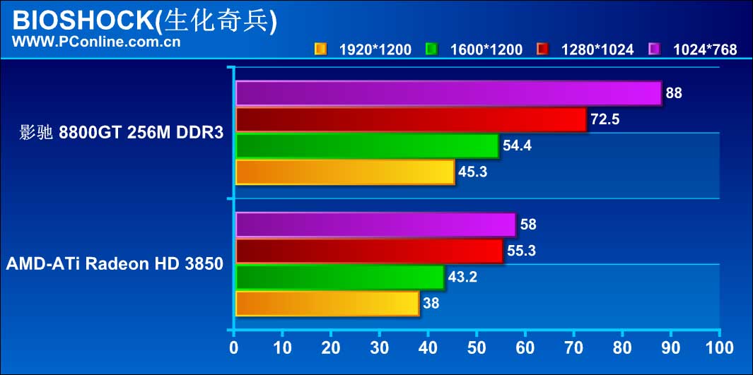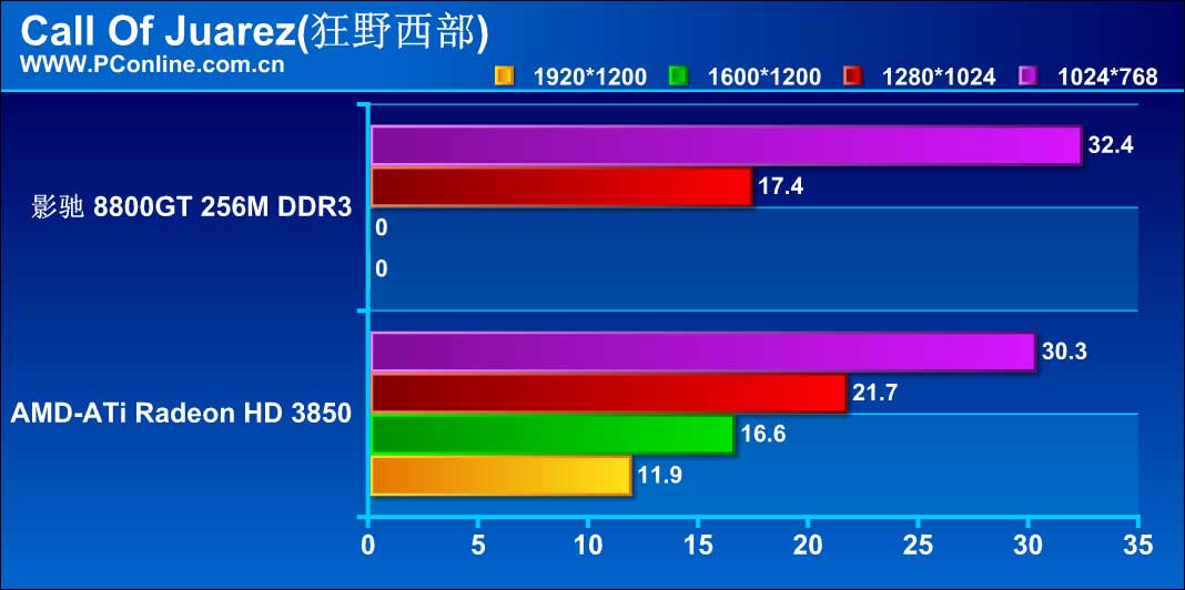 影驰 8800GT 256M DDR3在《Call Of Juarez》的评测中,随着分辨率的提高平均帧数下降相当明显,在1600*1200的分辨率下,其平均帧数已经低于10帧,画面犹如幻灯片,我们只能将分数记为"0"。