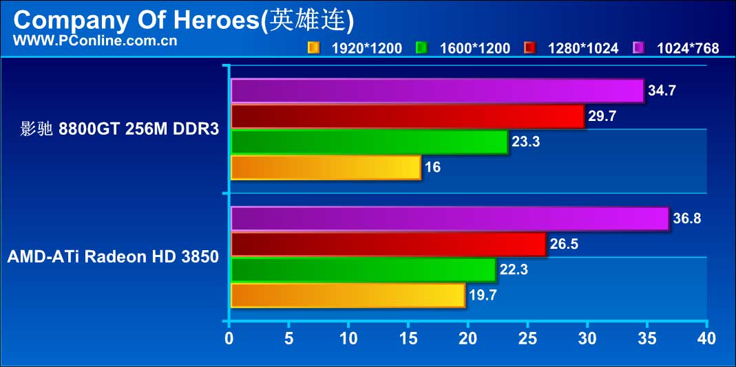 这是一款号称显卡杀手的游戏,两张显卡在这个游戏上都不能讨得甜头,而从平均帧数上我们可以看出,影驰 8800GT 256M DDR3还是要领先于Radeon HD 3850。