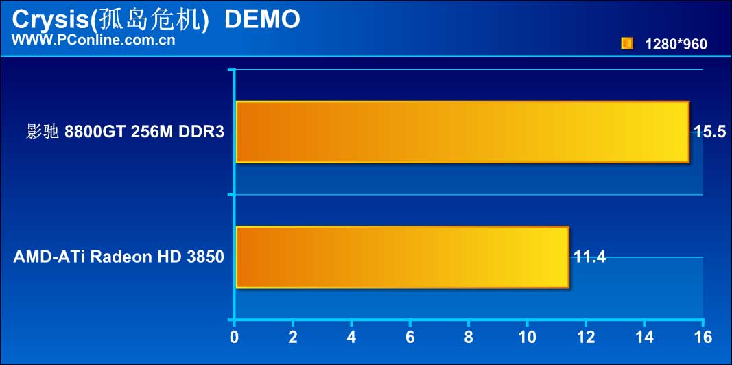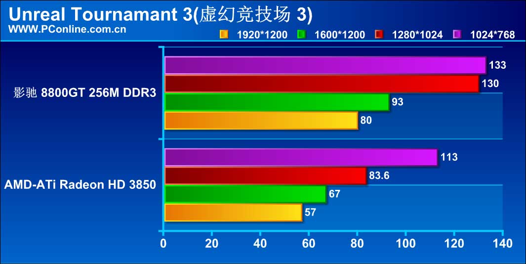 作为最新的DX9游戏,虚幻竞技场3对显卡的要求并没有太高,因此两张显卡都能胜任这个游戏的高分辨率考验。而影驰 8800GT 256M DDR3的表现还是领先于Radeon HD 3850。