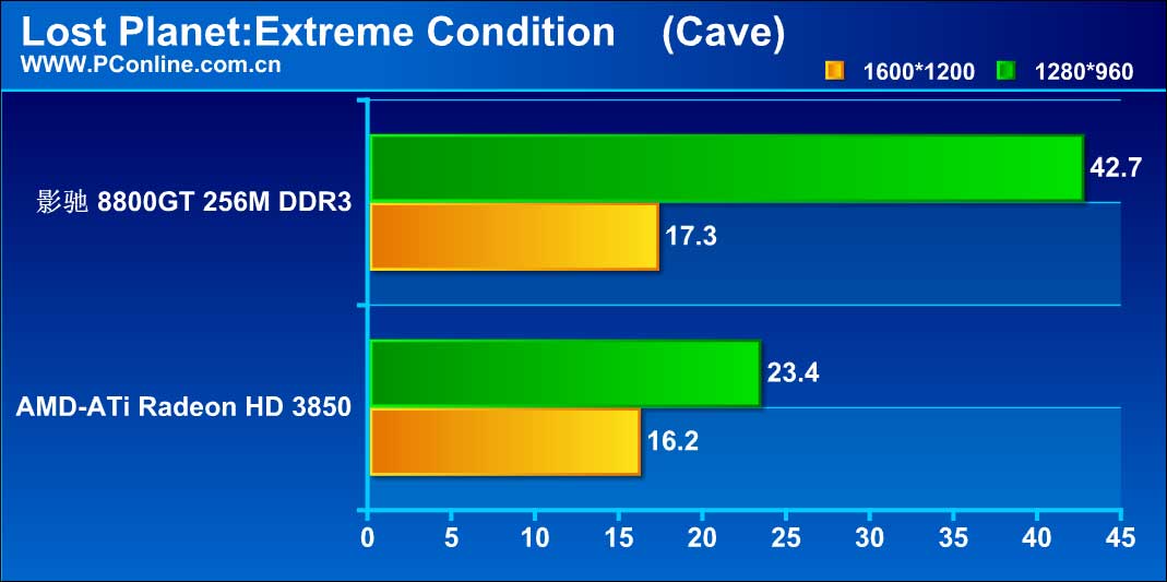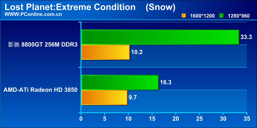 [/url] Lost Planet这个DX10游戏是著名的显卡杀手,在它自带的Performent Test下,Snow的场景足以令绝大多数的显卡感冒。AMD-ATi的Radeon HD 3850,即使在1280*960的分辨率下都不能流畅的运行,当分辨率提高到1600*1200时,已经基本进入幻灯片状态。而影驰 8800GT 256M DDR3,在标准分辨率1280*960下基本能够流畅运行,但当分辨率提高到1600*1200时,由于显存容量带来的瓶颈就相当明显,这时候已经不能流畅运行。