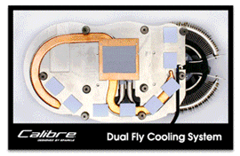 的图形芯片开始工作,铝制压铸散热底座当中的铜芯迅速将GPU热量传递到水平安置在散热底座当中的热管并将热量均衡迅速地向铝制压铸散热底座的左右两个部分传递,同时两根环形热管也将GPU的热量迅速传递到双翼散热鳍片上,而双风扇产生的强大风压和气流则将所有的热量吹出散热模块。这套