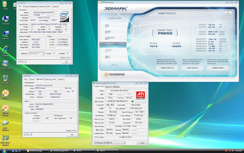 (同时也在网上找来其它人的测试成绩,分别有3870x2和9800GTX的,从图中看到GPU分数一项,4870胜出!CPU就别提了,人家都是QX9系列,我E6系列的CPU哪里比得过!)